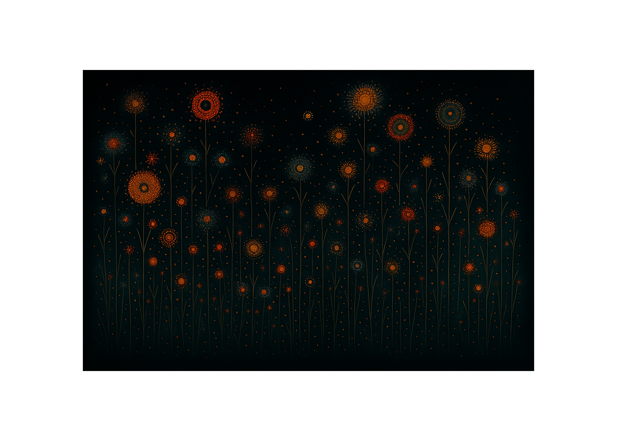 Bring the quiet magic of a midnight garden into your home. Floral Night is a whimsical digital art print featuring radiant blooms that sparkle like constellations against a deep night sky. Perfect for dreamers,