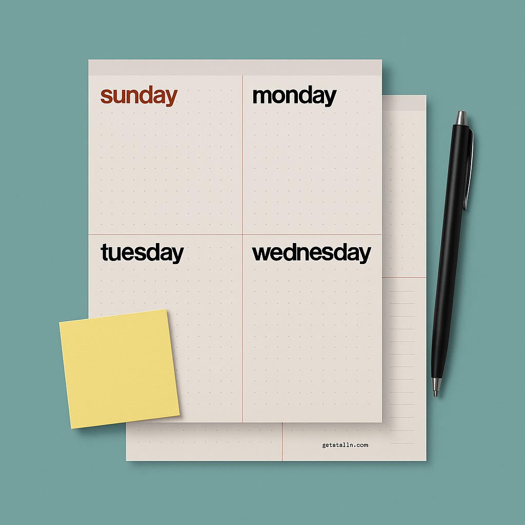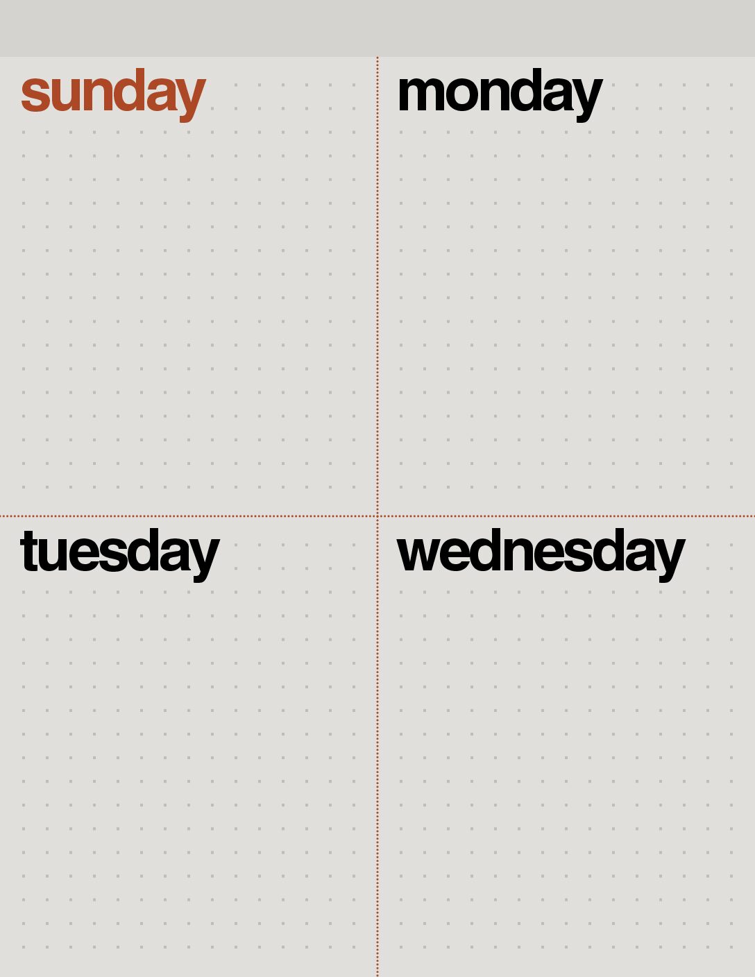 The design keeps things sharp and printer-friendly: dot-grid background for flexible writing, bold headers for easy navigation, and just enough space to keep your week tidy without feeling cluttered.