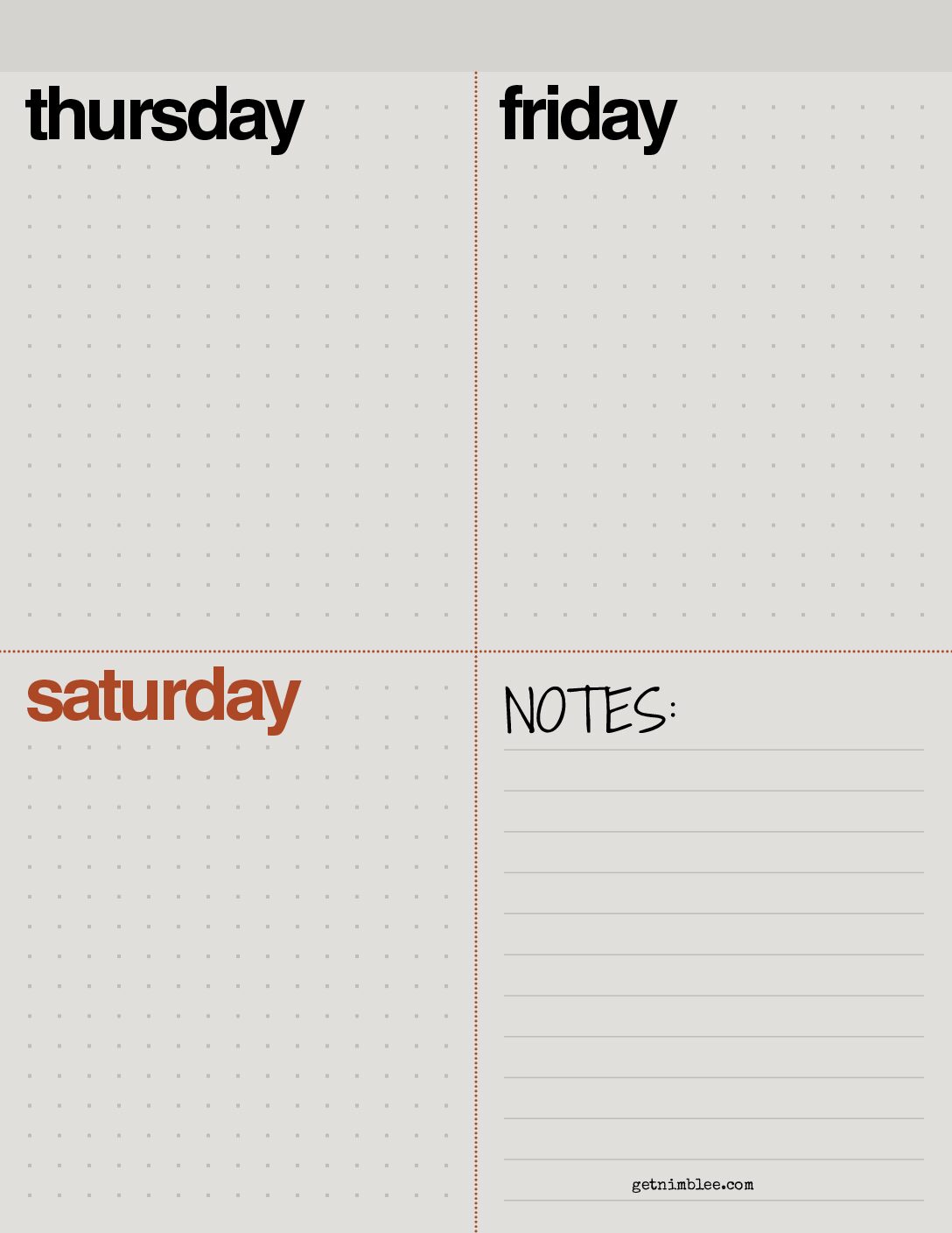 Page 2: Thursday through Saturday, plus a handy notes section for to-dos, reminders, or meal ideas.